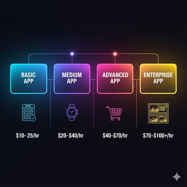 Basic App (e.g., simple UI, minimal features)$10 – $18/hour$20 – $30/hour$30 – $40/hour
