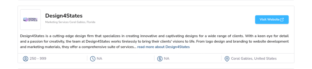 Design4States is a cutting-edge design and development firm offering branding, website creation, and marketing materials. Based in Coral Gables, they serve clients across industries with a focus on creativity, responsiveness, and visual impact.