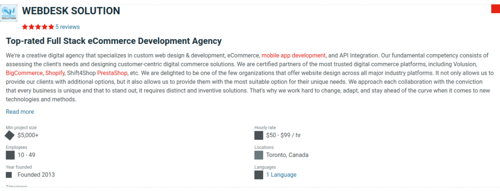 WebDesk Solution is a full-stack eCommerce development agency with a strong presence in Toronto. They specialize in building custom online stores and digital platforms using Shopify, BigCommerce, Volusion, and other major frameworks. As certified partners of multiple eCommerce platforms, they offer tailored solutions for B2B and B2C businesses across industries like retail, healthcare, and travel.